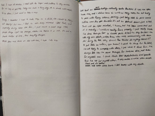 Cara is the result of our group’s collaborative book. We created a character, Cara, and her personal journal. This work was created to raise awareness about mental health, and throughout the journal, one can see the emotional ups and downs, and how hard people try to feel btter. At the end of the journal, there is a folded up letter from Cara’s best friend, and reading it makes one wonder what happened to Cara in the end.